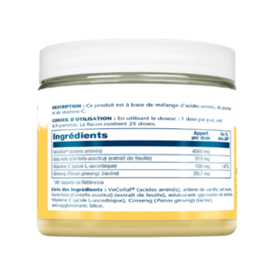 Liste des ingrédients : VeCollal® (acides aminés), arôme de vanille, sel marin, Gotu kola (Centella asiatica) (extrait de feuille), édulcorant : glycosides de stéviols, Vitamine C (acide L-ascorbique), Ginseng (Panax ginseng)(racine), anti-agglomérant: Silice.